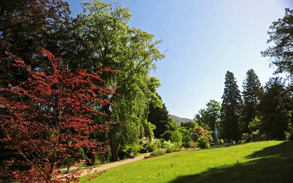 Schon in der Ära vor Krautinger kam das Raffinierte ins Spiel: Badenweilers Promenieranlagen wurden im englischen Stil angelegt und mit fremdländischen Gewächsen bepflanzt. Nur hatte der Park damals noch nicht die Dimensionen von heute. Zu Krautingers Verdiensten gehörte deshalb auch der Anschluss des Schlossparks. Wenn Sie heute beim Großherzoglichen Palais rechts abbiegen, gelangen Sie direkt hinein. Folgen Sie am besten der Kaffeemühle, Badenweilers Panorama-Rundweg führt zu den schönsten Aussichtspunkten des Kurparks. Lernen Sie im Hildegard von Bingen-Garten wichtige Heilkräuter kennen und bestaunen Sie im Gutedel-Garten über 70 verschiedene Gutedel-Variationen. Von der Burg Badenweiler eröffnet sich eine faszinierende Fernsicht auf Schwarzwald und Schweizer Alpen, vom Aussichtsplatz "Vogesenblick" sehen Sie bis zu Ostfrankreichs herrlichem Gebirgsmassiv. Und direkt vor der Nase: Palmen, Zedern, Oleander, seltene Kakteen, faszinierende Mammutbäume, Magnolien, Sumpfzypressen, heilsame Kräuter, Rebhänge - das ist mal grünes Multikulti!
