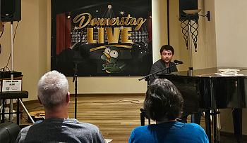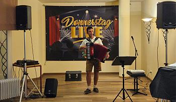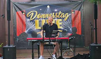 Ein Mann und sein Akkordeon stehen auf der Bühne. Jörg Hauser bringt außerdem noch die gute Laune mit. Heute ist bei Donnerstag live stimmungsvolle Hüttengaudi angesagt und Sie sind eingeladen, wenn beliebte Klassiker und Evergreens unterm Mammutbaum ertönen.