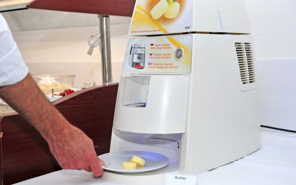 It starts at breakfast. At the buffet, we only offer regional products with zero waste packaging. Our innovative butter machine saves energy and packaging waste. And it's a lot of fun to use. Guests will find plates with fresh fruits and vegetables from our farm in Egringen, a large variety of cereal, freshly squeezed orange juice.