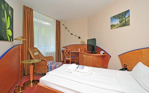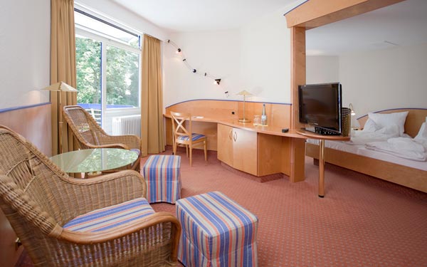 En 1997, ces chambres ont été confortablement meublées avec des couleurs fraîches et lumineuses, rénovées en 2011. Mobilier de charpentier de haute qualité, beaucoup d'espace de rangement. Toutes les chambres en or bleu disposent d'un balcon meublé avec une belle vue sur le parc de l'hôtel.