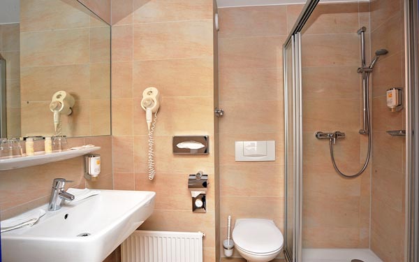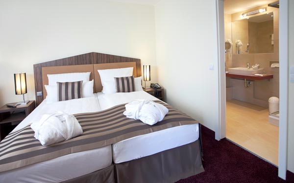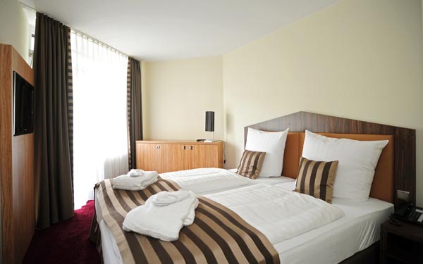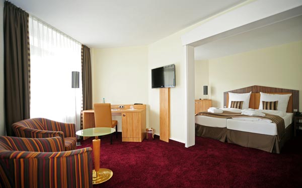 22 mètres carrés, au 4ème étage, balcon meublé, belle vue sur le parc, 2011 avec un mobilier design moderne et de haute qualité. Douche / WC, sèche-cheveux, miroir cosmétique, lit double sommier à ressorts (180 x 200 cm), bureau avec portrait empereur, coin salon, minibar, coffre-fort, téléphone, grande télévision par satellite à écran plat.