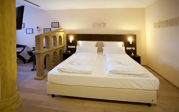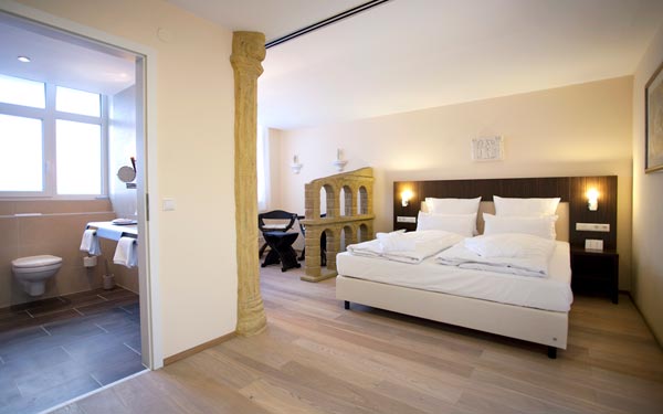 Dans nos cinq salles à thème romain, vous en apprendrez beaucoup sur les fondateurs de Badenweiler. Le point culminant sont les aqueducs à travers lesquels l'eau peut s'écouler en appuyant sur un bouton. Les chambres nouvellement construites en 2012 ont un inconvénient (pas de balcon) et deux avantages: de grandes salles de bains modernes et à seulement quelques pas de la piscine intérieure et du sauna. Vous pouvez donc vous déplacer en grande partie dans votre peignoir.