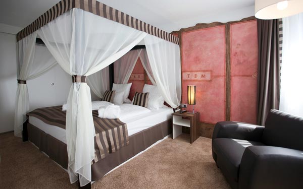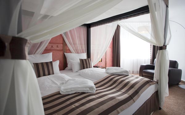 Chambre spacieuse avec lit à baldaquin "Carpe noctem" (200 x 200 cm), baldaquin et fauteuil en cuir de luxe.