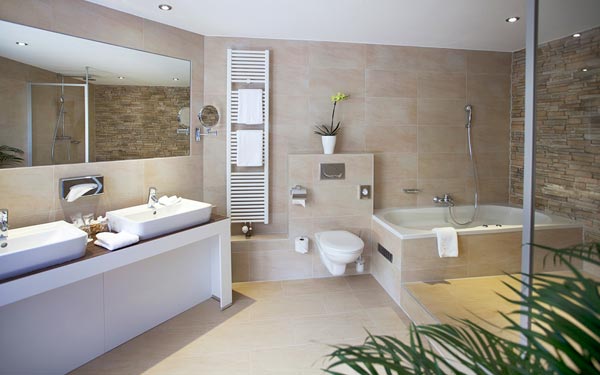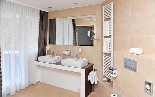 Salle de bain spacieuse et luxueuse avec accès au balcon privé, baignoire, grande douche sans seuil, double vasque, sèche-serviettes, toilettes, bidet, sèche-cheveux, miroir cosmétique. Deuxième WC supplémentaire séparé.